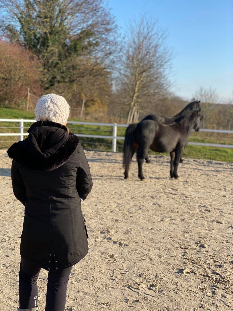 Aufstellungsarbeit: Danach übertragen wir die visualisierte Situation in den Raum. In der klassischen Aufstellungsarbeit wird das oft in einem Zimmer gemacht, im pferdegestützten Coaching machen wir das draußen bei den Pferden. Wir benutzen Gegenstände, die jeweils für einen Aspekt in dem behandelten Thema stehen: ein Pylon steht dann zum Beispiel für das Ziel, eine bessere Beziehung zum eigenen Pferd zu bekommen und ein Markierteller repräsentiert die eigene Erwartungshaltung, die vielleicht im Weg steht.